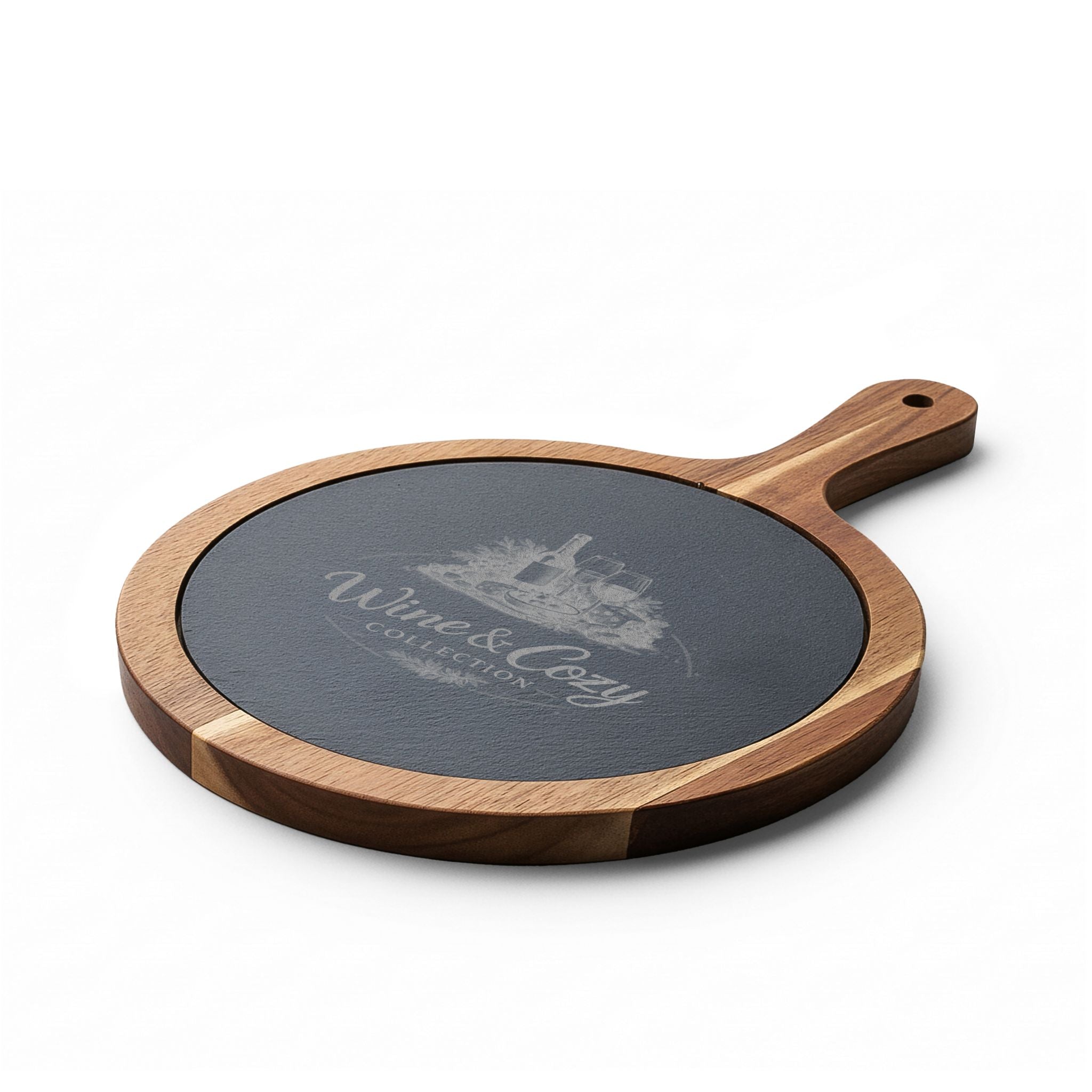 A warm, tactile serving companion that brings slow evenings to the table. This acacia and slate board pairs rich, striped wood grain with a removable, engravable slate circle — an elegant stage for cheeses, cured meats, and small bites. Two wooden-handled cheese tools tuck neatly into carved slots so everything is ready when guests arrive. The engraved slate wears a soft light-grey mark, adding a personal, artisanal touch that ages beautifully with use. Keep it close for cozy wine nights, casual dinner gatherings, or relaxed house visits when you want food and conversation to take center stage.