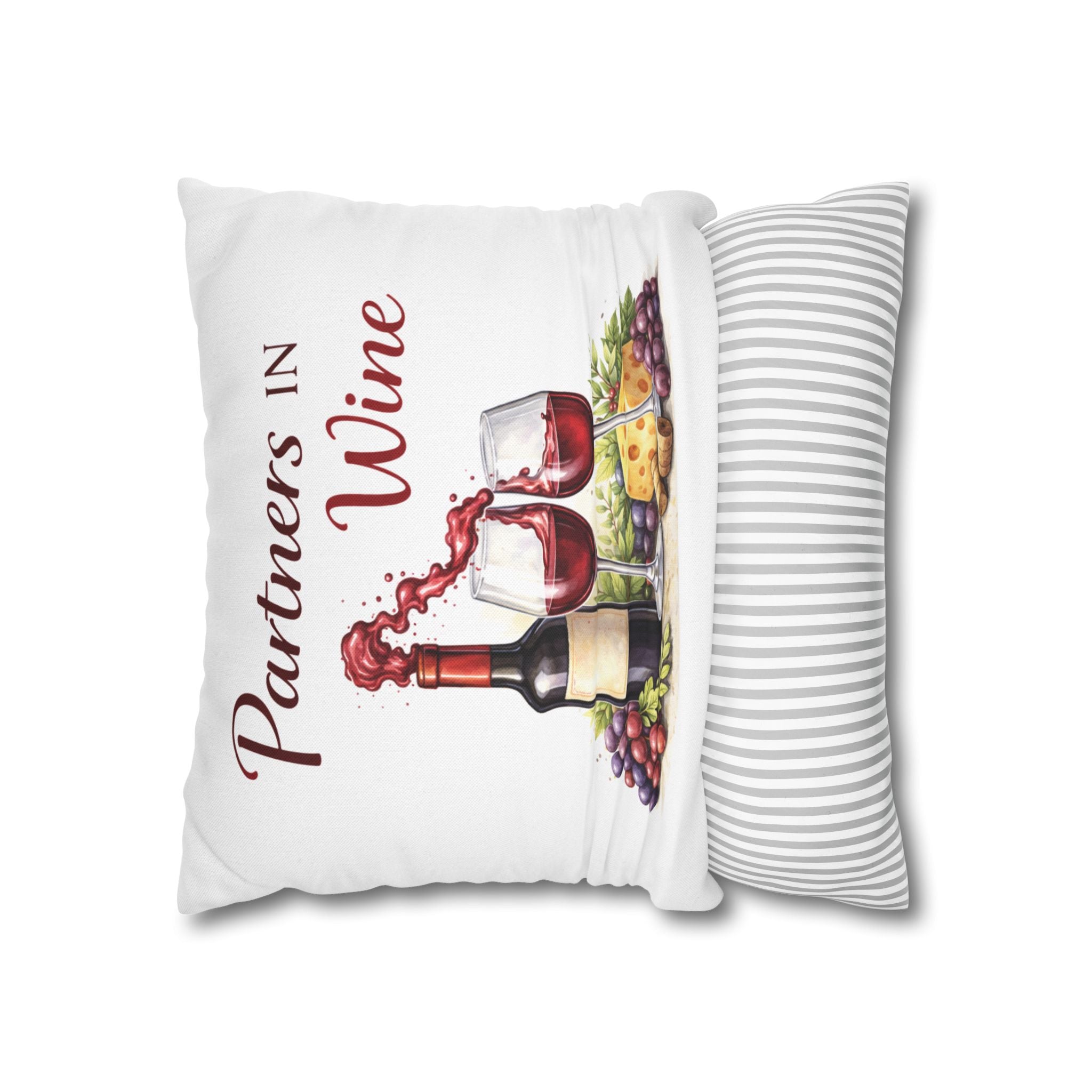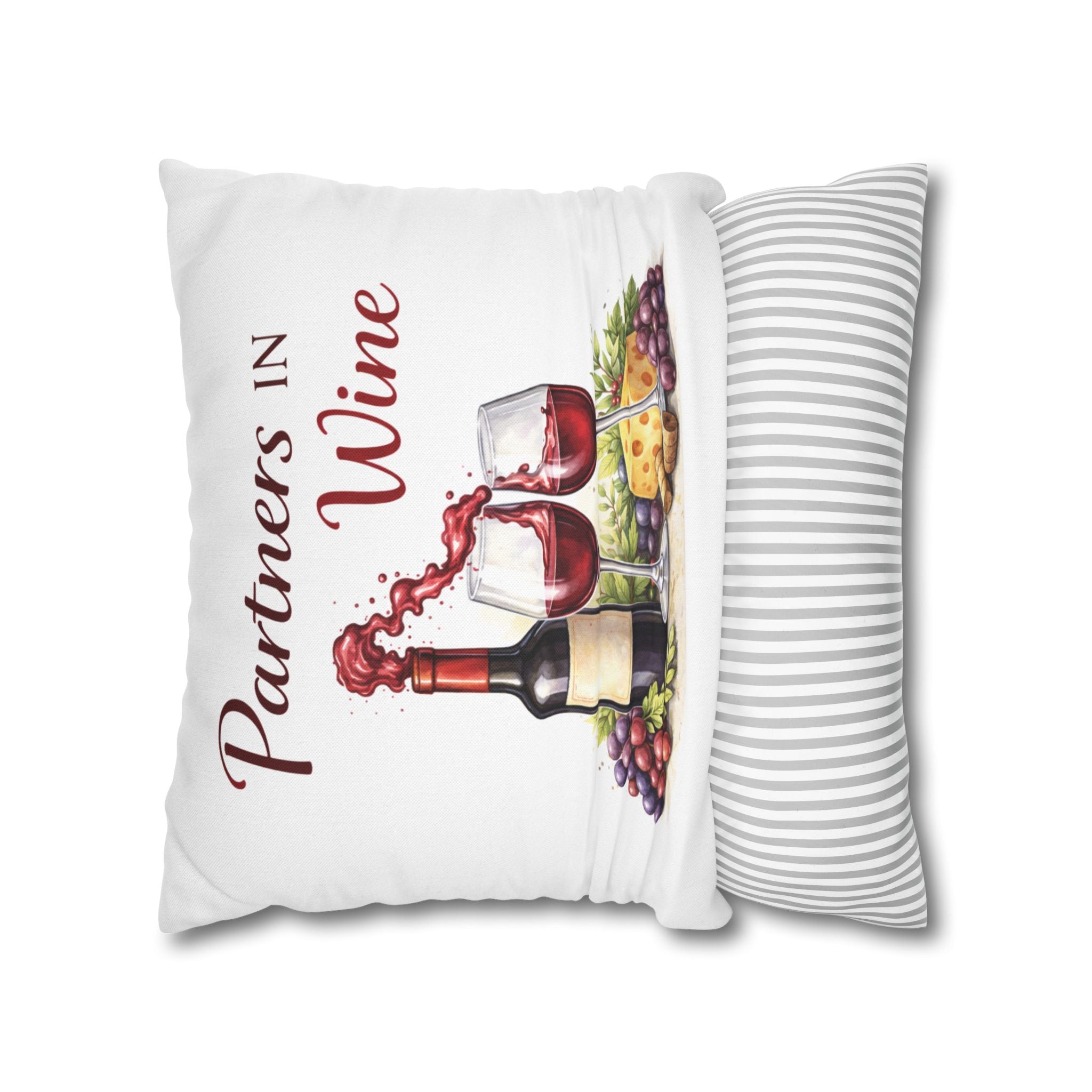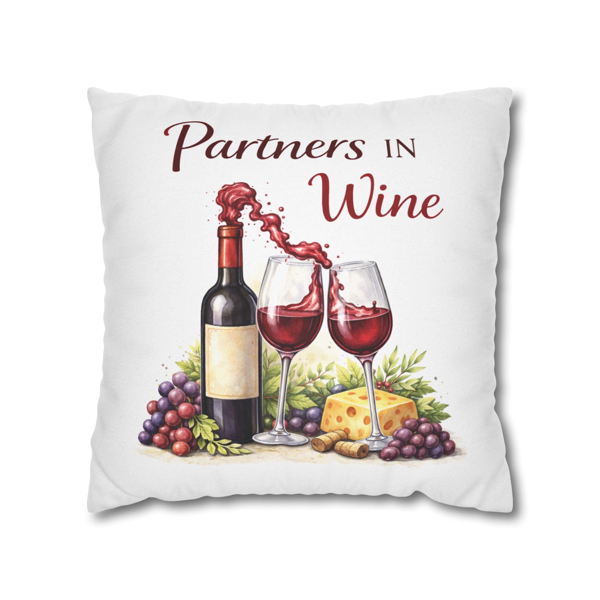Warm, cozy, and a little bit cheeky — this spun polyester square pillowcase brings wine-night charm to your couch or reading nook. Soft to the touch and printed on both sides, it shows a watercolor-style vignette of a bottle, two overflowing glasses, grapes and cheese, with the playful line “Partners in Wine.” The neutral-backed zipper nestles into the seam so the art remains the focal point. Toss it on a loveseat during an evening of board games, lean into it on a sunlit breakfast bench, or layer it with striped and textured pillows for an easy, lived-in vignette that invites conversation and slow-sipped moments.